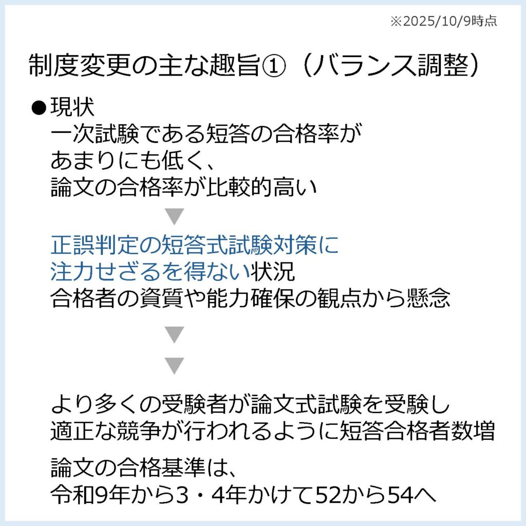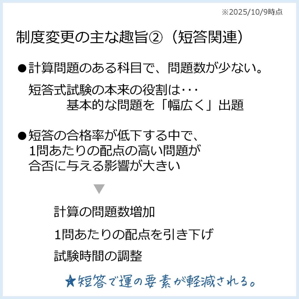 令和8年第1回短答式試験(令和7年12月実施)から、問題数の増加、1問あたりの配点引き下げ、試験時間や出題順の変更が行われます。