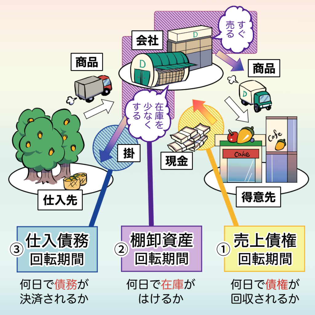 まず③を大きくするためには、仕入先への商品代金の支払期日をできるだけ延ばす(たとえば現金取引でなく掛取引を行う)ことが挙げられます。