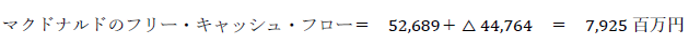 上のグラフは、縦軸の0より上がプラス、下がマイナスの金額であることを表しています。企業の成長段階においては、営業CFはプラス、投資CFはマイナスが望ましいと言われています[2]。これに基づくと、マクドナルドのキャッシュ・フローは毎期、良好な状況であると判断できます。