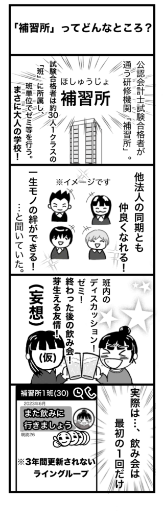 同期は全員、同じ年度の公認会計士試験合格者という状況です。自分も含め、みんな、「あの戦い(論文試験)を勝ち残った者たちなのか…」と思うと全員が眩しく見えます。