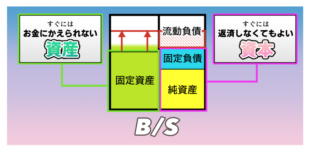 仮に、100%を上回る状態、つまり固定資産の金額が「固定負債+純資産」を上回る状態(図の赤の矢印)となれば、1年以内に返済すべき流動負債に対する資金を作るために、固定資産を売却しなければならない恐れが出てきます。