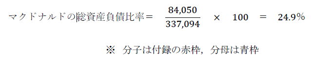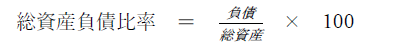 貸借対照表の負債を総資産で割った指標で、次のように求められます。